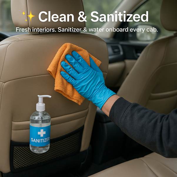 “Clean rides, every time. Our cabs are sanitized daily, with fresh seat covers, tissues, and sanitizers always available. Travel in comfort knowing hygiene is never compromised.”